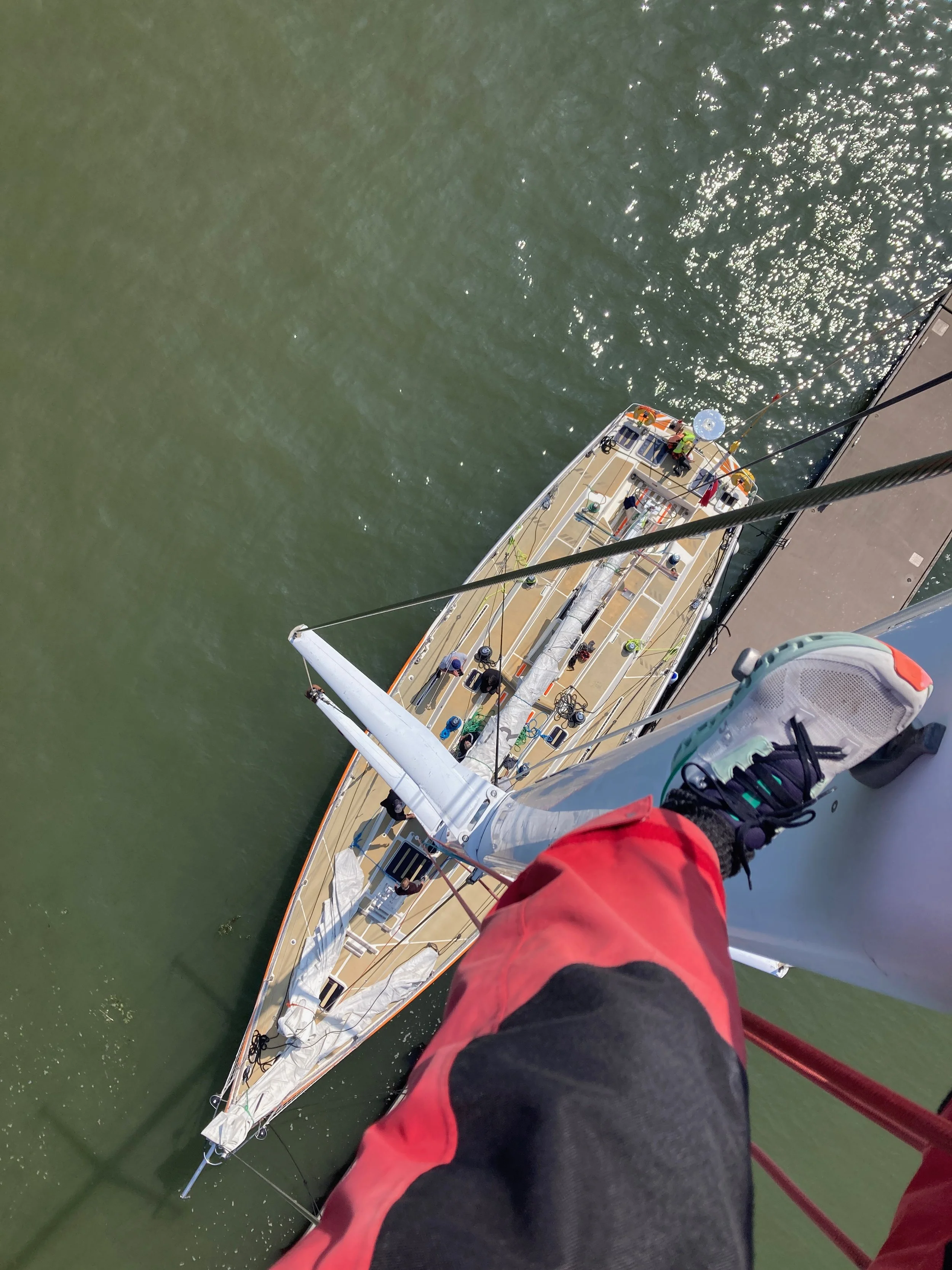 Me, taking a look down from the 30 meter mast while anchored in Cowes on the Isle of Wight